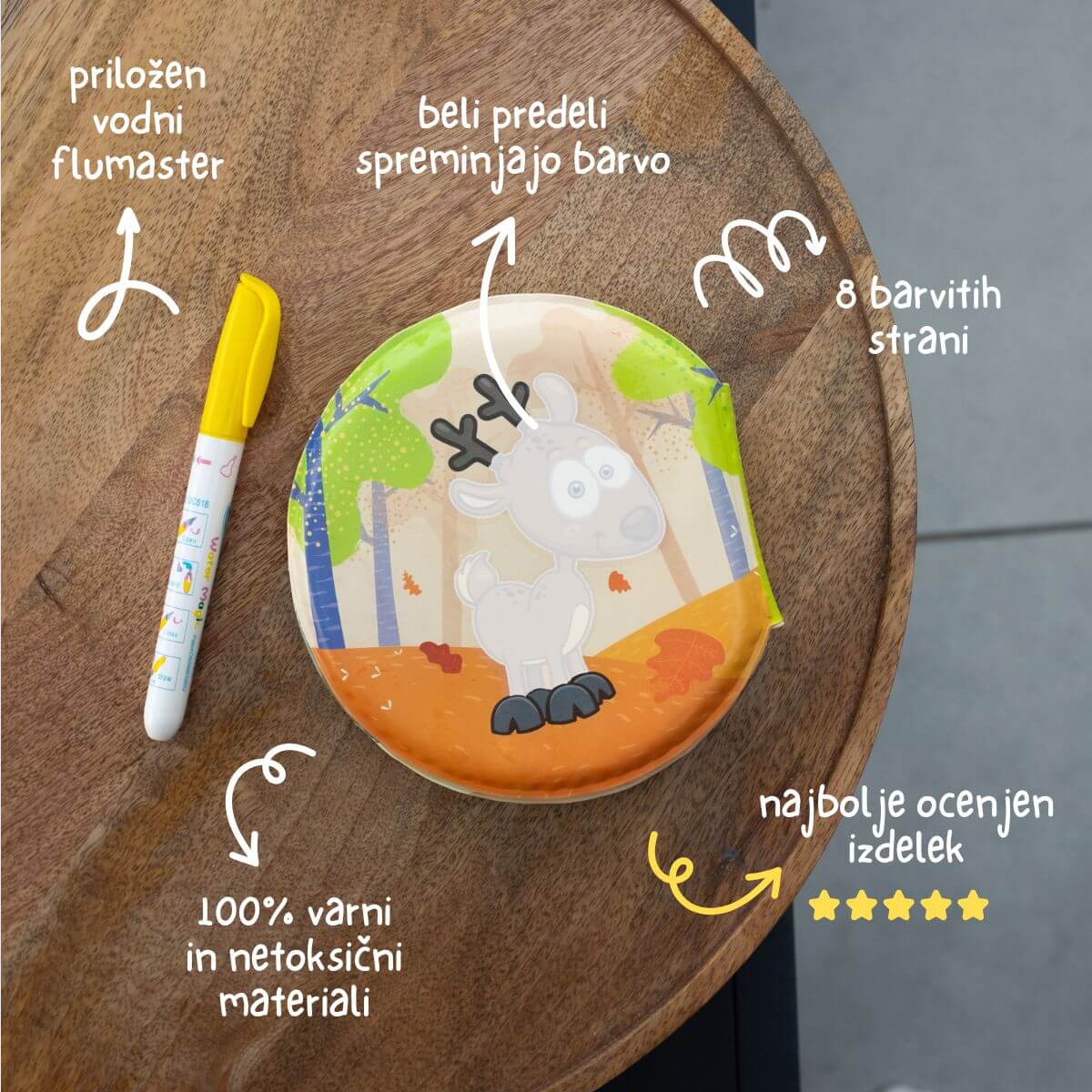 Hledáte způsoby, jak podpořit vaše batole v tvoření hodiny a hodiny, bez nepořádku, špíny a znečištění? Měkká vodní knížka se vybarví přiloženým vodním fixem nebo prsty a objeví se nádherné barvy tropických zvířátek. Po několika minutách stránky uschnou a můžete je vybarvovat znovu a znovu. Knížka je vhodná i pro večerní koupání nebo hru v bazénu. Pro nespočet vybarvování. Bezpečné pro malé ručičky a zvědavá kousnutí.